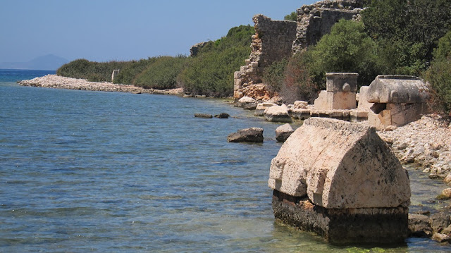 After walking among the ruins of the ancient city for a while, the route leaves the coastline and, after a slight climb over a hill, reaches the town of Kaleüçağız.